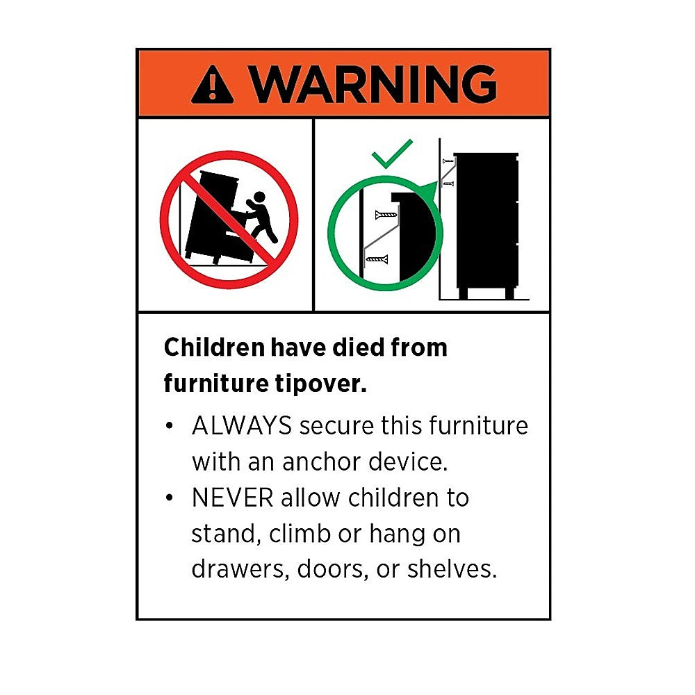 - NEVER allow children to stand, climb, or hang on drawers, doors, or shelves.