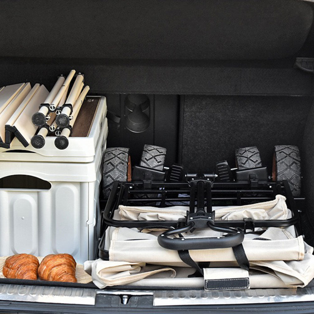 Easy to Fold Store: All terrain collapsible folding outdoor wagon cart has internal pull rope design, it can be folded in seconds. No need to install, easy to operate and transport. With a compact design this thing folds into a mini size that you can simply fold it with one hand. It is convenient to be stored at home, garage and car boot. SpaceLabor Saving.
