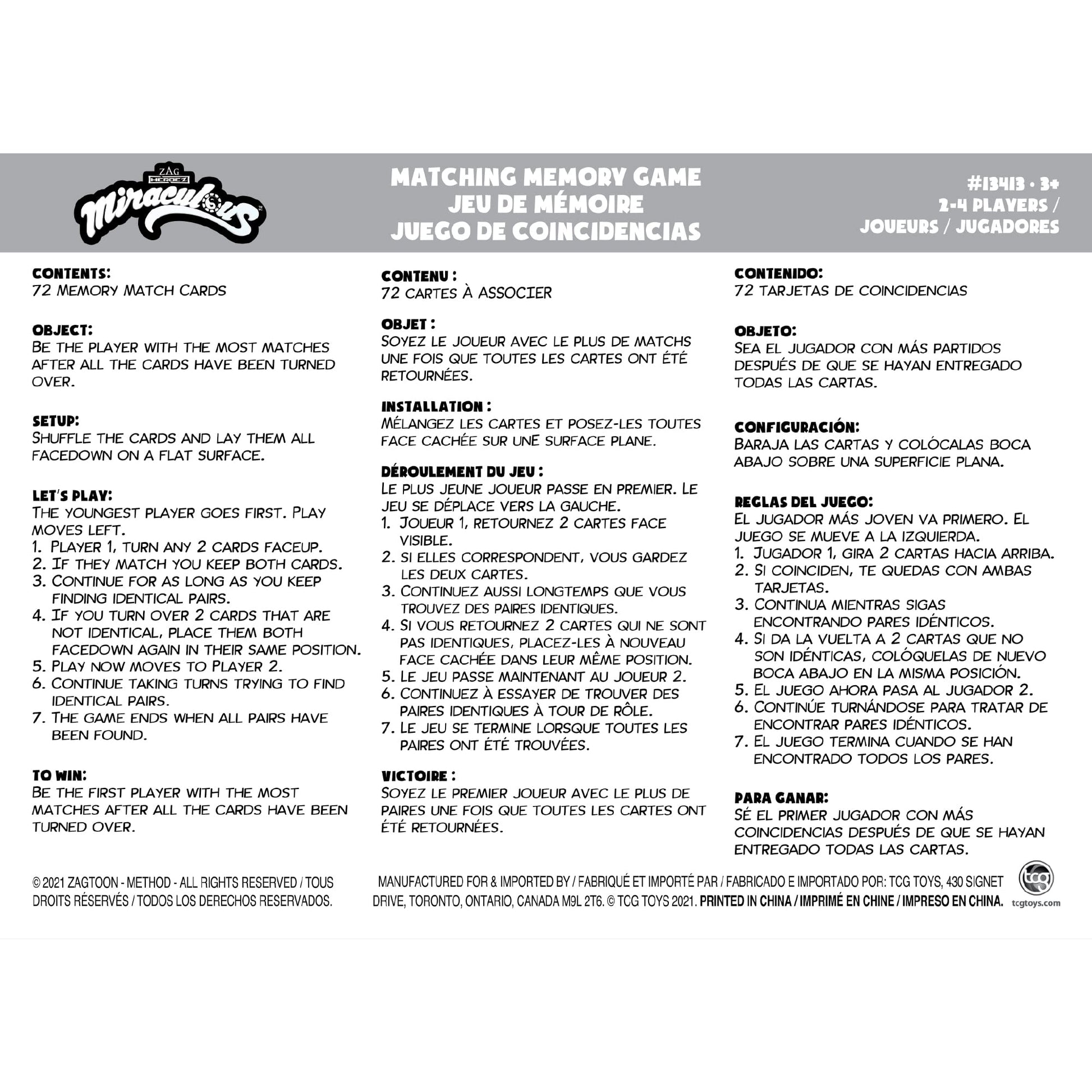 - Match the most cards to win in this Miraculous Ladybug memory learning card game. Playing this game can help kids recognize matches and improve their concentration and visual memory; important for reading, writing, and lots of everyday activities. The deck has 36 matching pairs; use some or all to adjust the level of difficulty for one or more players.